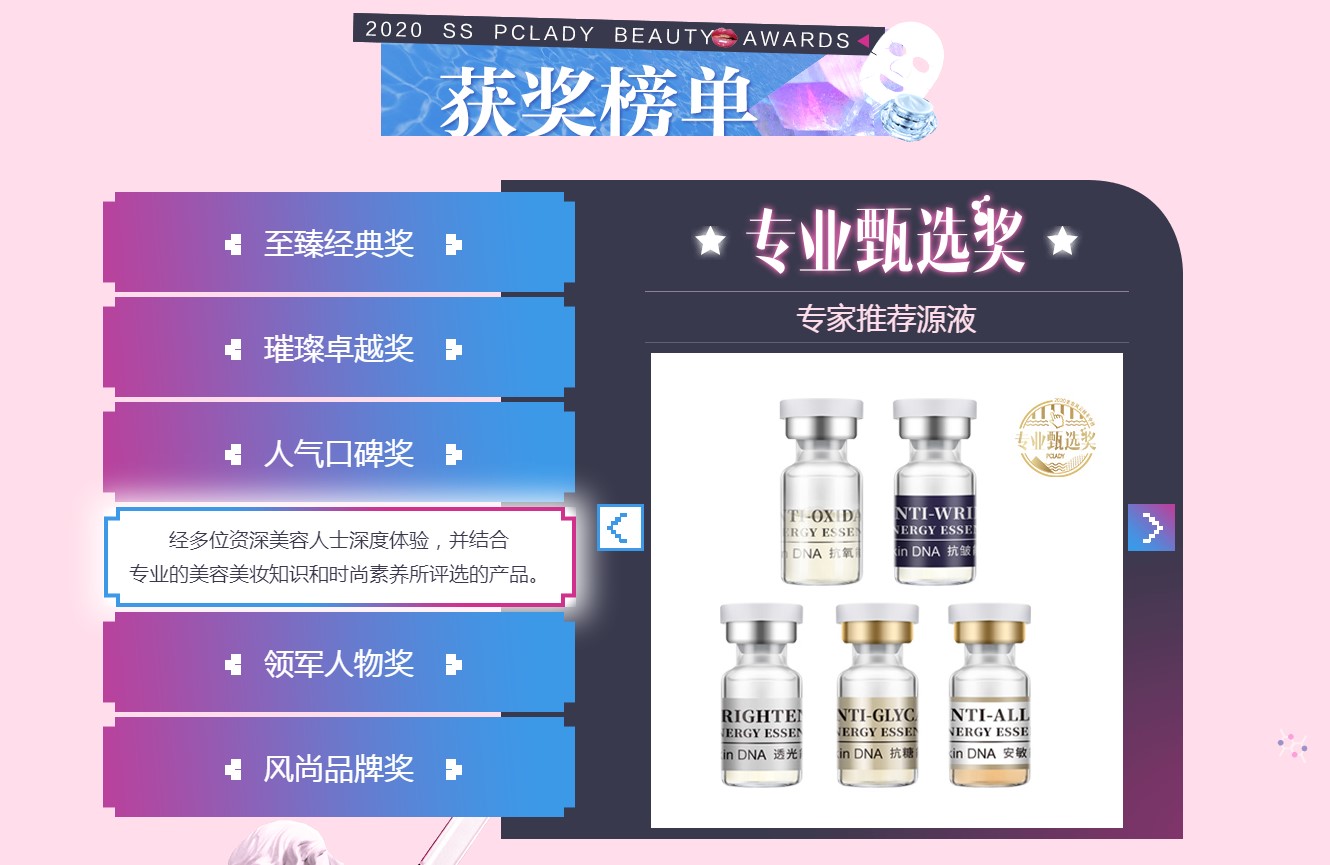 据悉,2020年度PCLADY美容风云榜年中榜汇集42个品类,300+品牌,共计1500余产品参与大奖评选。经由护肤美妆专家进行深度成分分析与体验测评,独家邀请护肤美妆专家老师解释成分背后的功效,为大家剖析高活成分的影响力;结合太平洋自有平台和全网其他平台的数据智能分析,综合网络热度点评、电商指数、消费者口碑反馈评选,蔓之研SkinDNA能量源液系列实力突围,成为专业护肤领域崛起新星。